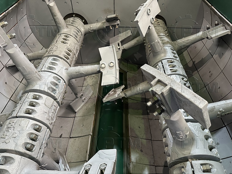 2. Валы и лопасти: вращающиеся валы движутся в противоположных направлениях, создавая силы смешивания. На валах установлены стойки с лопастями, которые перемещают материалы в разные направления и обеспечивают равномерное смешивание. Стойки и лопасти выполнены из высокопрочного износостойкого чугуна, срок эксплуатации два года.