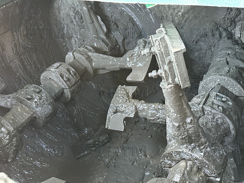 2. Валы и лопасти: вращающиеся валы движутся в противоположных направлениях, создавая силы смешивания. На валах установлены стойки с лопастями, которые перемещают материалы в разные направления и обеспечивают равномерное смешивание. Стойки и лопасти выполнены из высокопрочного износостойкого чугуна, срок эксплуатации два года.