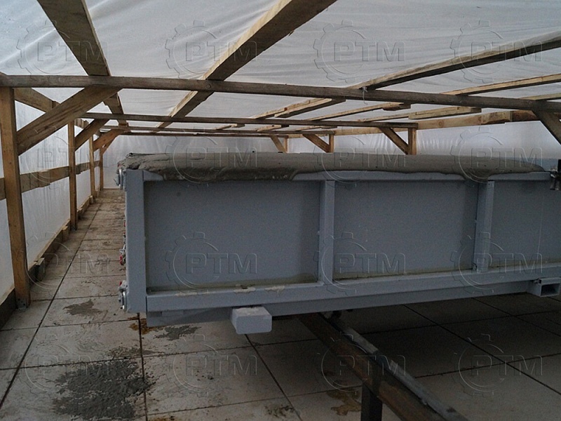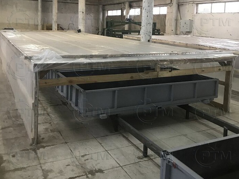 Борт форм образует форму для газобетонного массива с габарита 2400*600*300 (д*ш*в) мм, стандартно это 12 блоково шириной 200 мм. Форма выполнена из профильной трубы с листовым металлом, толщиной 2 мм. Для простоты сборки формы на ней установлены эксцентриковые замки (8 шт). Имеется паз для центровки бортов на поддоне форм (основание формы), а так же данные борта форм оснащены резиновым уплотнителем для герметизации собранной формы. После установки бортов на поддон форм, форма полностью готова к заливке газобетонной смеси.