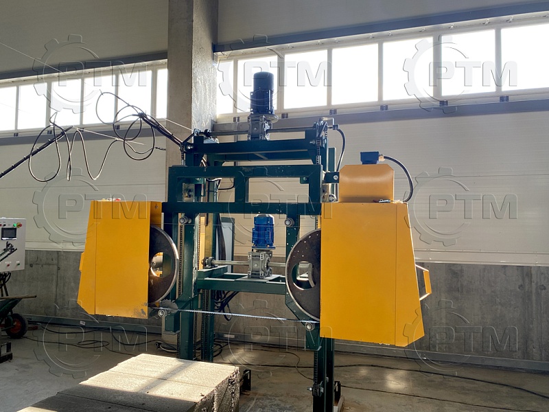 Резка массива газобетона: Резка осуществляется при помощи пильного резательного комплекса с числовым программным обеспечением, кратность резки 100 мм. Стандартные блоки шириной 100 мм, 200 мм, 300 мм, 400 мм. При необходимости можно запрограммировать любую ширину блока.