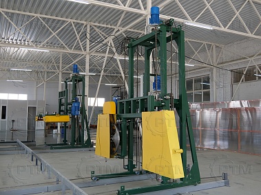 Транспортировка массива газобетона: Массив газобетона транспортируется по рельсовым путям с помощью электромеханического толкателя, из форм создается подобие поезда, одно основание толкает другое. Так происходит перемещение массива по заводу.