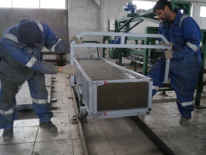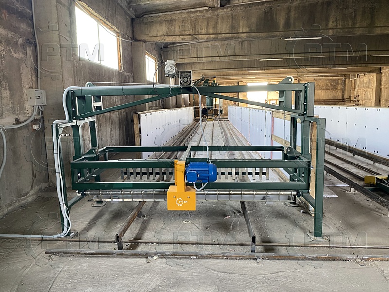 Транспортировка массива газобетона: Массив газобетона транспортируется по рельсовым путям с помощь электромеханического толкателя, из форм создается подобие поезда, одно основание толкает другое. Так происходит перемещение массива по заводу.