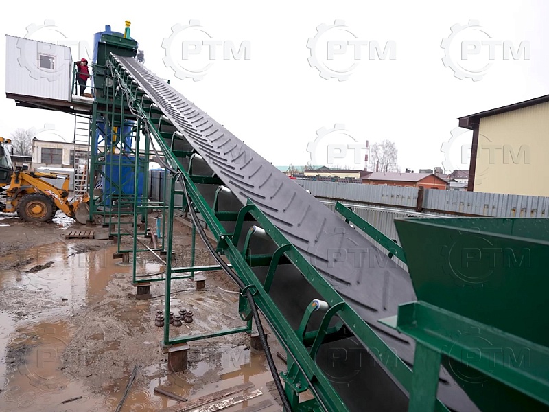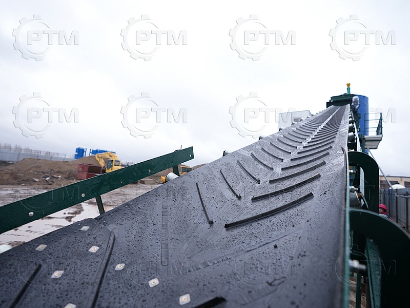 Ленточный конвейер имеет рамную конструкцию с фермами. В нижней и верхней части ленточного конвейера устанавливаются барабаны с футеровкой, ведущий барабан приводится в движение при помощи червячного мотор-редуктора. Конвейерная лента шевронная закрытого типа. В нижней части конвейера имеется приемный бункер, конвейер имеет от бортовку, это необходимо чтобы инертные материалы не просыпались с ленточного конвейера при транспортировки инертных материалов в бетоносмеситель. Все конвейерные ролики оцинкованные.