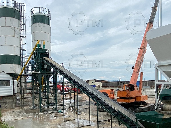 Ленточный бетонный завод с двухвальным бетоносмесителем — это производственное оборудование, которое используется для смешивания и производства бетонной смеси с высокой производительностью и качеством, завод автоматический, принцип “одна кнопка” он состоит из следующих основных компонентов: