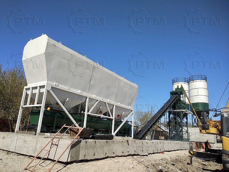1. Дозирующий комплекс СТ-60 (3 секции по 20 м3): состоит из двух до четырех бункеров для хранения инертных материалов (щебень, песок, отсев). На каждом бункере имеется два пневмо- затвора, необходимых для точной дозации материалов. При дозировании материалы попадают на весовой ленточный конвейер, весовые датчики фирмы CAS Ю.Корея, при наборе нужного количества материалов, заслонки закрываются, подача прекращается. Объем каждого бункера от 2,5 м3 до 20 м3, в зависимости от комплектации завода. Каждый бункер оснащен вибродвигателем MVE 300/3.