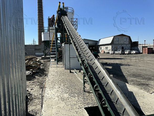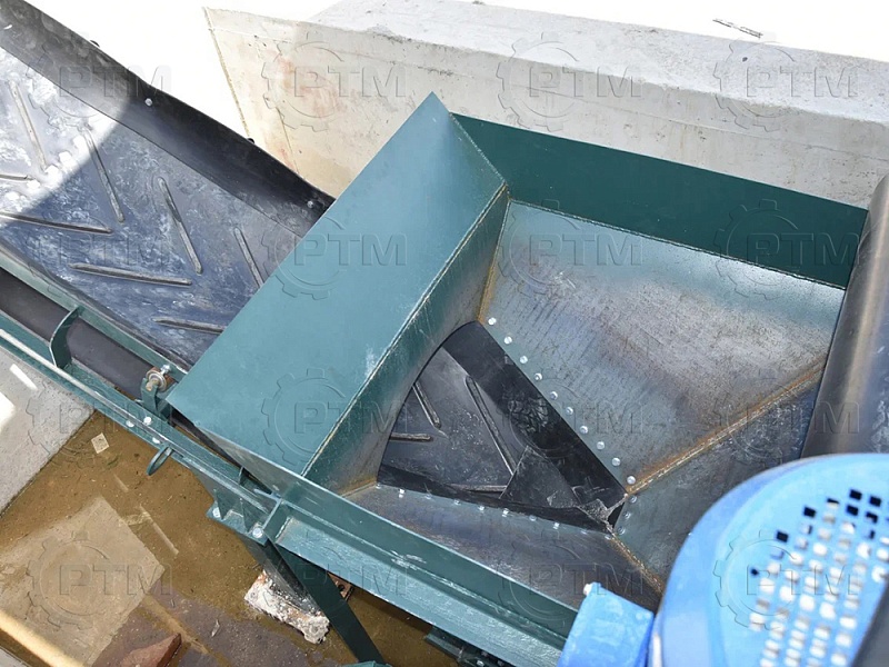 2. После набора нужного количества материалов инертные попадают на наклонный ленточный конвейер с шевронной лентой. Ширина ленты 600 мм, длинна конвейера 16 метров.