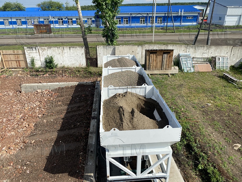 1. Дозирующий комплекс СТ-40 (2 секции по 20 м3): состоит из двух до четырех бункеров для хранения инертных материалов (щебень, песок, отсев). На каждом бункере имеется два пневмо- затвора, необходимых для точной дозации материалов. При дозировании материалы попадают на весовой ленточный конвейер, весовые датчики фирмы CAS Ю.Корея, при наборе нужного количества материалов, заслонки закрываются, подача прекращается. Объем каждого бункера от 2,5 м3 до 20 м3, в зависимости от комплектации завода. Каждый бункер оснащен вибродвигателем MVE 300/3.