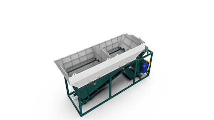1.     Дозирующий комплекс МБ-24 (2 секции по 12 м3): состоит из двух до четырех бункеров для хранения инертных материалов (щебень, песок, отсев). На каждом бункере имеется два пневмо- затвора, необходимых для точной дозации материалов. При дозировании материалы попадают на весовой ленточный конвейер, весовые датчики фирмы CAS Ю.Корея, при наборе нужного количества материалов, заслонки закрываются, подача прекращается. Объем каждого бункера от 2,5 м3 до 20 м3, в зависимости от комплектации завода. Каждый бункер оснащен вибродвигателем MVE 300/3.