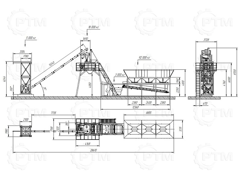 Данный завод производительность от 35 до 45 м3/час товарного бетона марки м200 или раствора. Объём загрузки бетоносмесителя 1200 литров, объем выгрузки готового бетона 800 литров. Один цикл не более 55 секунд. Время работы цикла регулируется оператором бетонного завода.