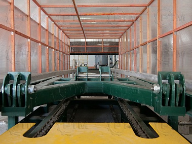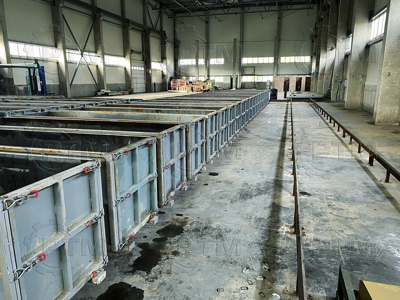 Транспортировка массива газобетона: Массив газобетона транспортируется по рельсовым путям с помощью электромеханического толкателя, из форм создается подобие поезда, одно основание толкает другое. Так происходит перемещение массива по заводу.