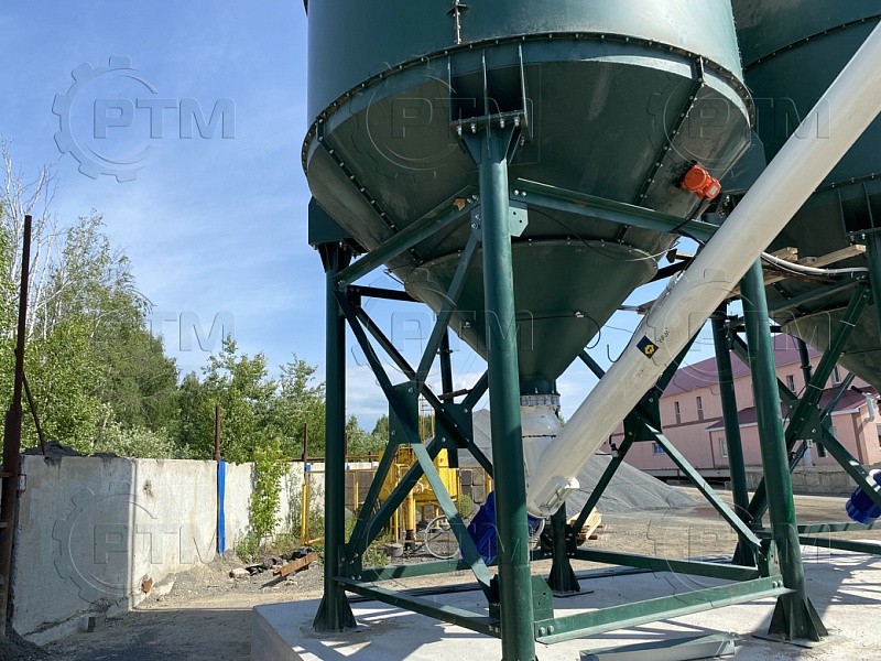 Силос цемента предназначен для хранения цемента на площадке. Силос принимает цемент по трубе закачки от цементовоза, сохраняет его от внешних воздействий. Далее цемент подается при помощи шнекового конвейера на блок дозаторов. На блоке дозаторов взвешивается и попадает в производственный цикл бетона на бетонном заводе.