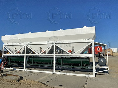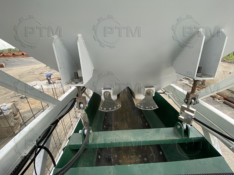 1.     Дозирующий комплекс СТ-20 (2 секции по 10 м3): состоит из двух до четырех бункеров для хранения инертных материалов (щебень, песок, отсев). На каждом бункере имеется два пневмо- затвора, необходимых для точной дозации материалов. При дозировании материалы попадают на весовой ленточный конвейер, весовые датчики фирмы CAS Ю.Корея, при наборе нужного количества материалов, заслонки закрываются, подача прекращается. Объем каждого бункера от 2,5 м3 до 20 м3, в зависимости от комплектации завода. Каждый бункер оснащен вибродвигателем MVE 300/3.