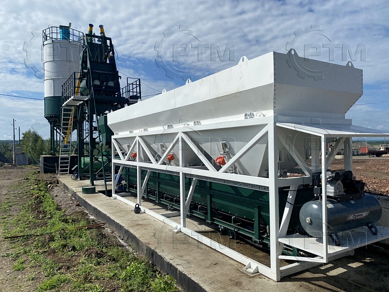 Скиповый бетонный завод с двухвальным бетоносмесителем — это производственное оборудование, которое используется для смешивания и производства бетонной смеси с высокой производительностью и качеством, завод автоматический, принцип “одна кнопка” Он состоит из следующих основных компонентов: