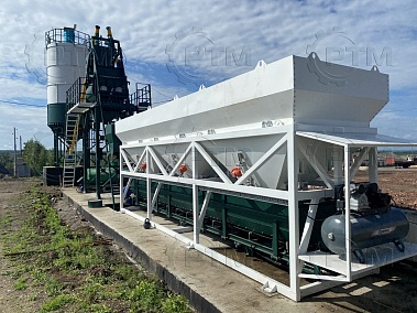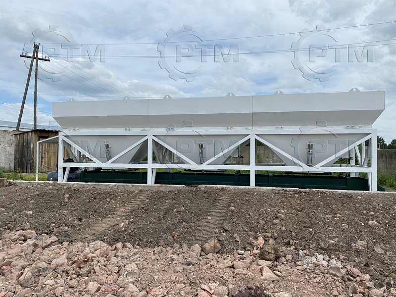 1.     Дозирующий комплекс СТ-40 (2 секции по 20 м3): состоит из двух до четырех бункеров для хранения инертных материалов (щебень, песок, отсев). На каждом бункере имеется два пневмо- затвора, необходимых для точной дозации материалов. При дозировании материалы попадают на весовой ленточный конвейер, весовые датчики фирмы CAS Ю.Корея, при наборе нужного количества материалов, заслонки закрываются, подача прекращается. Объем каждого бункера от 2,5 м3 до 20 м3, в зависимости от комплектации завода. Каждый бункер оснащен вибродвигателем MVE 300/3.
