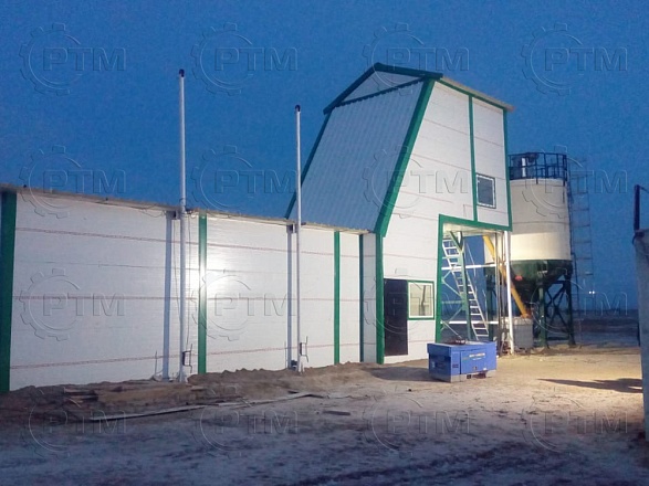 Зимний бетонный завод с двухвальным бетоносмесителем — это производственное оборудование, которое используется для смешивания и производства бетонной смеси с высокой производительностью и качеством, завод автоматический, принцип “одна кнопка” Он состоит из следующих основных компонентов: